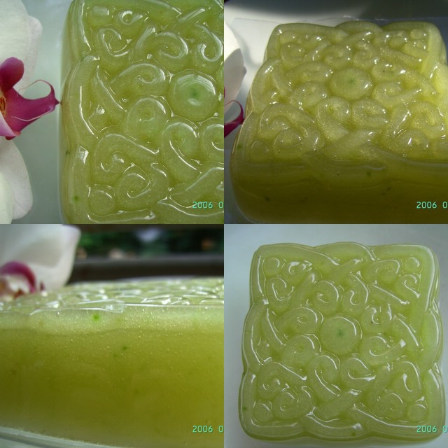 汗滴禾下土的攪著一鍋山苦瓜皂,心裏卻一派出塵的寧靜,初初Trace是青蘋果的嬌綠,入模後轉成湖綠和翠綠,更有晶瑩剔透翠玉般的結晶感,美得讓心在炎炎夏日靜了下來,希望熟成後仍保有這一抹綠,讓夏日悄悄的涼意稍息。