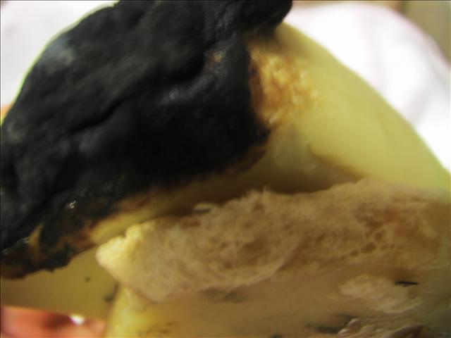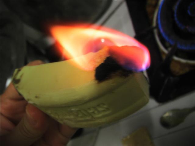 a-2a-3. 30秒後快速溶解、皂滴滴落,小小燃燒,1.5分鐘後,表面結成像絲瓜酪一樣,但顏色較之稍焦黑,味道稍刺鼻