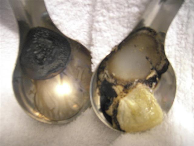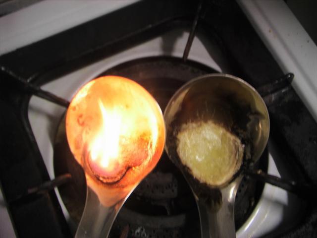 d1. 30秒後快速沸騰,水分蒸發較慢,80秒後開始燃燒變火皂(比潔膚露火光更猛),熊熊燃燒60秒(火皂燃燒30秒後關掉爐火),開始冒出濃煙與更刺鼻惡臭,5分鐘後燒過的液皂一片焦黑,需用刷子用力刷才能洗淨湯匙