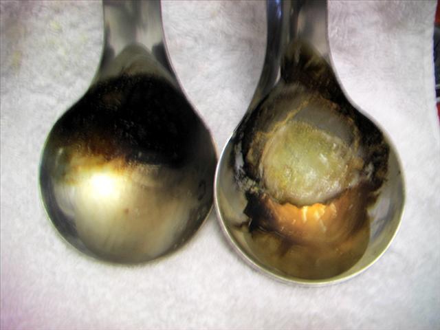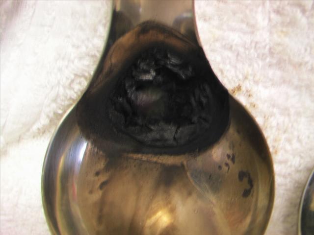 b-1. 30秒後快速沸騰,1分鐘後快速失水,3分鐘後開始燃燒變火皂(火皂燃燒30秒後關掉爐火),關火後熊熊燃燒30秒熄滅,開始冒出濃煙與刺鼻惡臭,5分鐘後燒過的液皂一片焦黑,需用刷子用力刷才能洗淨湯匙