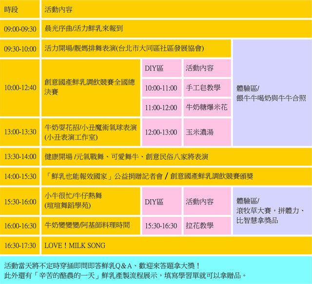 這是一個純公益推廣的活動,咖啡拉花PK賽和創意市集目的,是推廣多元運用國產鮮乳的概念,強調鮮乳不僅能吃、能喝、能用、還能玩。請看活動表,真是粉精彩,有喝有吃有免費DIY可玩,還有餵牛牛體驗,以及阿基師牛奶變變變料理教學,真是值得來看看玩玩囉。