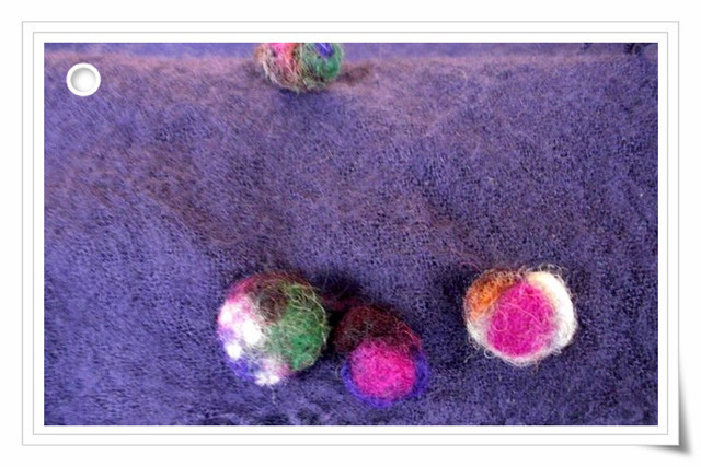 一顆球平均花了510分鐘,一整個週末,我和哥哥認真的搓圓球,混色變出每顆與眾不同的幸運彩球來,65顆與眾不同的彩球躍上小紫圍巾,綻放美麗的氣息和創意。現在這個小紫是全世界獨一無二、價值連城囉……