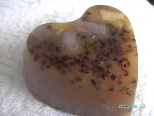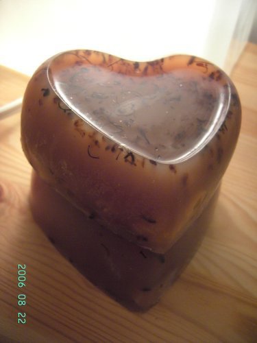第一次使用皂基,用來做母乳皂,雖然好洗,但相較純手工皂總是略帶澀感,因為皂基的成分良莠不齊,可能一不小心就買到工業用化學皂基,而當中的珍貴甘油成分,大都已被粹取出,更為了呈現頭明光澤,而使用酒精!希望這一袋是天然的甘油皂基,微黃透明感,味道上充滿皂的味兒,似乎還挺天然的,就來做個薰衣草皂,紫色透亮的光澤,包覆著薰衣草、桂花、玫瑰的芳華,還特地加了可以增添滋潤效果的幾種手工皂粒,再搭配新敗心形皂模,我的紫色戀人,似乎擁有讓人一見鍾情的魅力呢!相約要做幾塊手工皂給老闆和她的孩子們,希望他們喜歡!