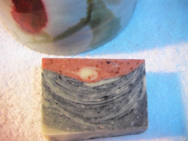 這一次添加一點點的紅豆到炭皂裏,竟然多了一種視覺的挑動,彷彿反璞歸真的憎人遇上青春正艷的姑娘,於是八風吹不動的凡心大動了起來,入世與出世的掙扎在一念之間...會不會想太遠了...