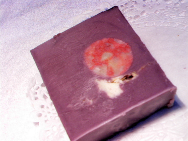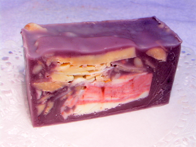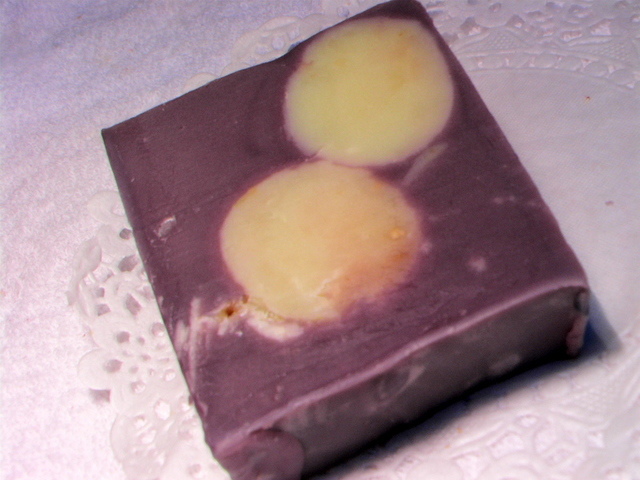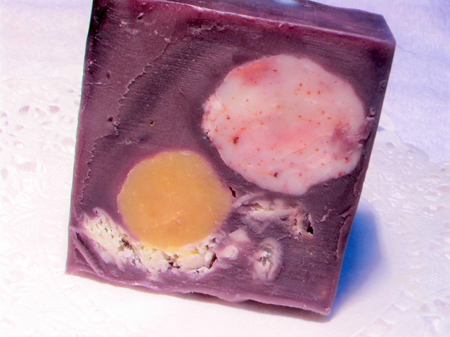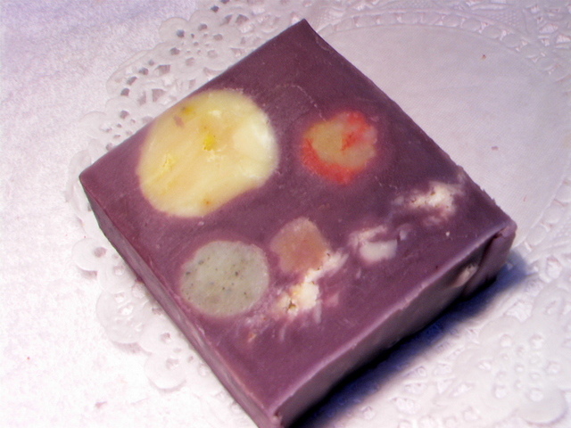 明瑾的媽是一個談起女兒來手足舞蹈、連眼睛都會笑的媽咪,這是明瑾媽咪的另一款封奶作,她選擇的是和小小白媽咪同一款的紫草疼惜平安皂。因為上次做的紫草皂靛藍偏紫的顏色太深沉了(泡了四個月的紫草大顯神威),這一次YamaMa想加入其他不同顏色的球型及片型皂塊來呈現一種繽紛喜悅(再加上明瑾媽偏好方型的皂型),果真有核桃糕的養眼效果。