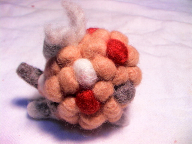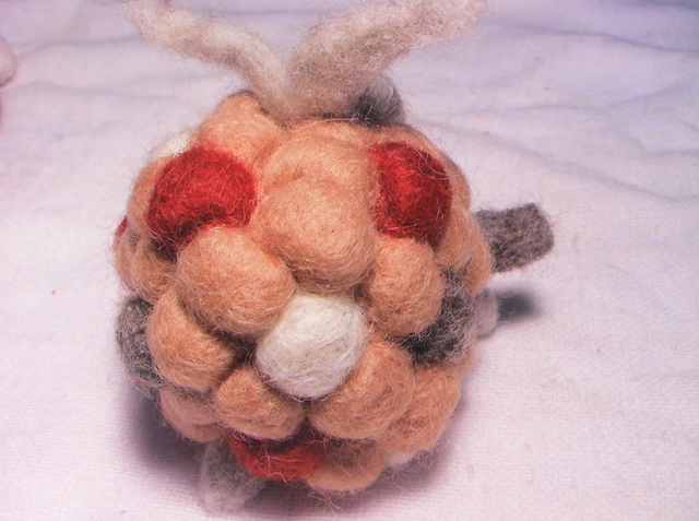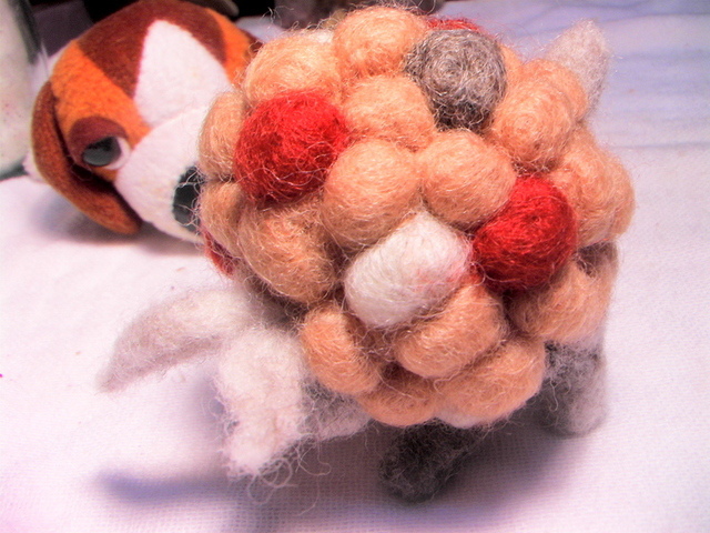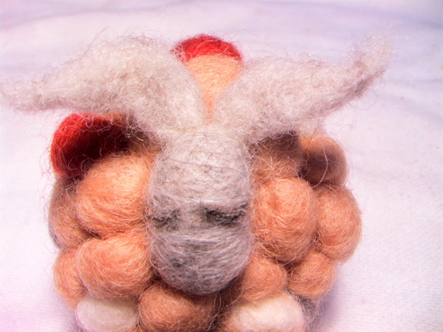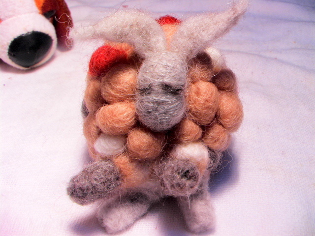 三天之內,陸陸續續用了四個小時,斷了兩根搓搓樂針,針出這個有趣的作品。一開始是要做一隻小綿羊,初作完成乍看之下像烏龜,因為身子太圓了不夠長、而且頭重腳輕,於是,思考研究了兩天,決定幫小羊加上一對像天使翅膀一樣飛揚的耳朵,還有手足舞蹈(四腳朝天)的四隻腳,而竟然,就像了跳舞的羊還是懷孕的羊媽媽呢?