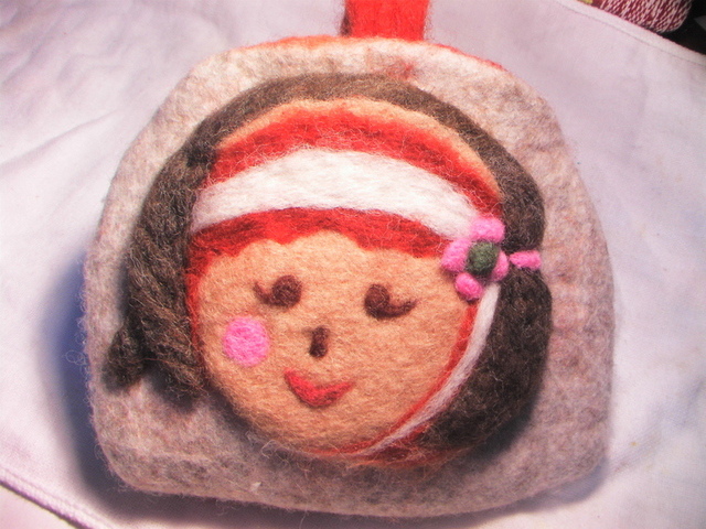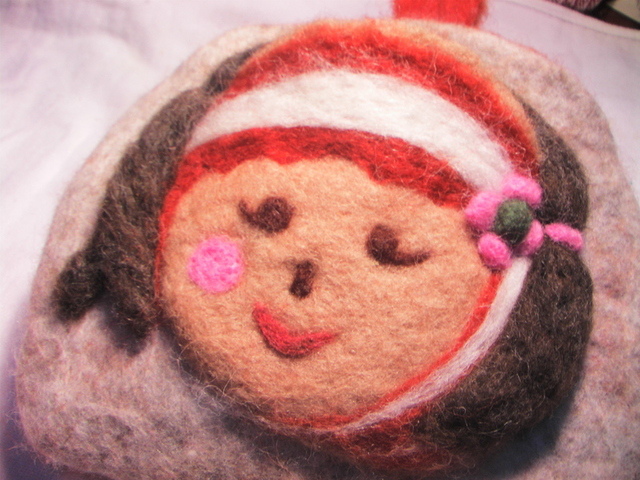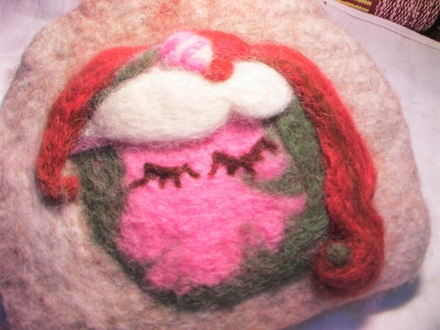 因為YamaMa的構圖比較複雜,前後各附加一個小外袋,在課堂上花了兩個多小時使盡吃奶力氣最後一個完成水氈原形,回家後再用兩天的時間修改作品,結果在上週日和小山拎著指間娃娃到台大校園逛一圈曬太陽,還挺得意的。