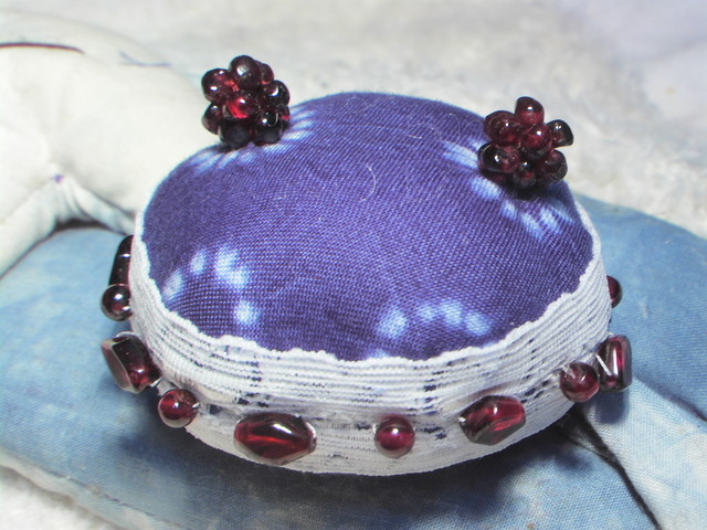 首先試做的是南瓜針插,一口氣試做三款(當然,超乎想像花了非常多的時間),拙劣的小學生手縫技術,剛好用緞帶和我那塵封已久的飾品珠珠藏拙,倒還有一股特殊的華麗風味,尤其是哪個藍染布(半碼100)的針插,還讓我愛不釋手呢,雖然後來捨棄南瓜的造型,自由亂做。