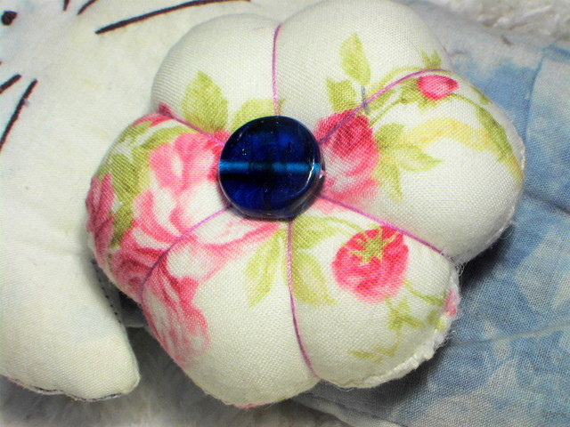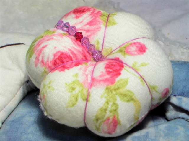 齊藤瑤子玫瑰花布的南瓜針插,算是比較像南瓜,雖然藏針看得很清楚,棉花塞得不夠飽滿,就算是成長中的小南瓜吧。