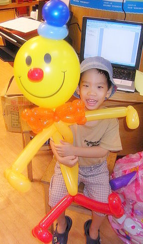 週三晚上氣球姊姊給Yama創作的造型氣球是快樂先生,Yama給快樂先生選穿橘色的衣服,紅色的褲子,姊姊給快樂先生加上了紅鼻子,和Yama最愛的藍帽子。