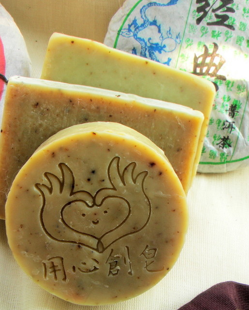 不知從何而起,辦公室和朋友間昇華起一股普洱茶風與瘋,主要是Kim特愛普洱,他影響了大家的品味,目前收藏已可以喝足到七十歲的他,收藏普洱是為了品茶也喜歡送人,到不是為了數年倍增的普洱身價。央他給我特愛的兩款茶入皂,他選了兩款01年孟海茶廠紫大益-口感略甜,加上02年香港商千年古茶樹-口感微酸,歷經十年光陰的沈澱與醞釀,在沐浴的當下,以茶養身,安享人生處處有餘的片刻悠閒,細品人生猶有回甘的好味道。