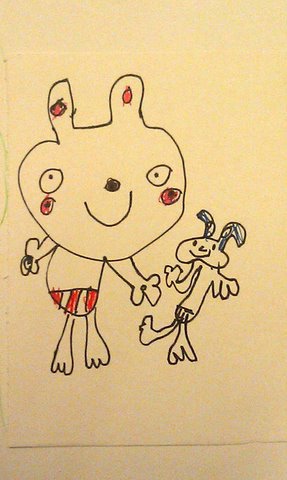 品品看了,硬是抱著不肯鬆手呢,而Yama小山哥哥,直嚷著:我也要一個娃娃,還跟著畫了一個咚咚,和妮妮媽阿姨PK一下,也補償一下擁有短耳兔的快樂。