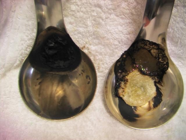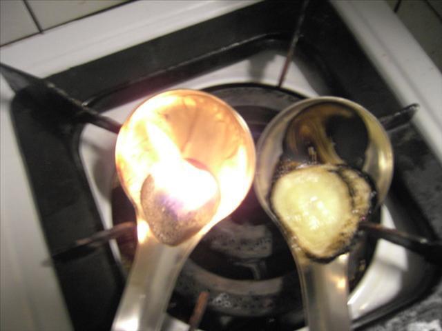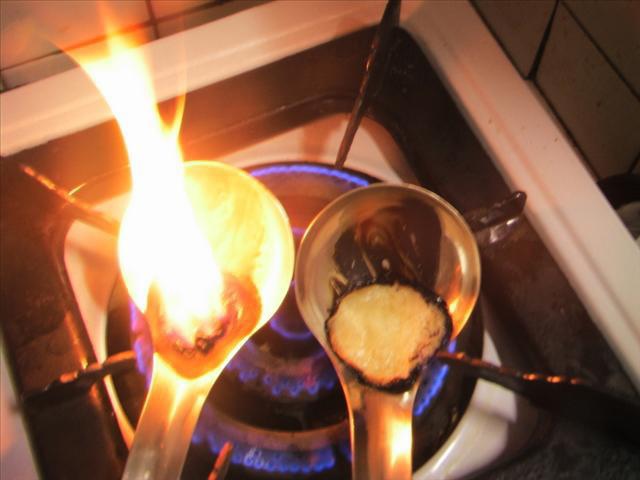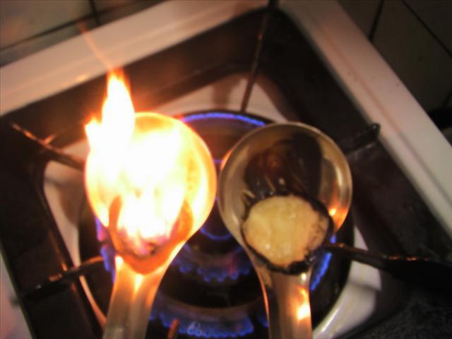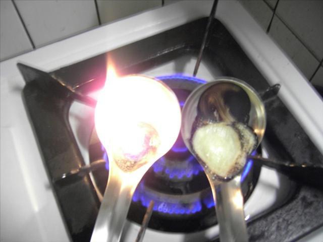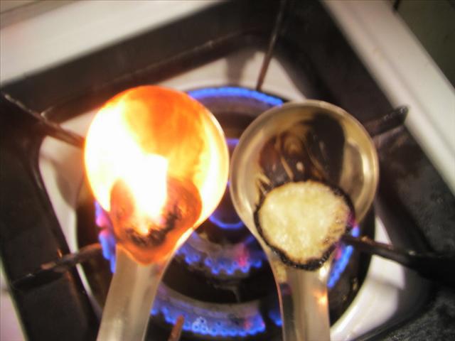 b-1. 30秒後快速沸騰,1分鐘後快速失水,3分鐘後開始燃燒變火皂(火皂燃燒30秒後關掉爐火),關火後熊熊燃燒30秒熄滅,開始冒出濃煙與刺鼻惡臭,5分鐘後燒過的液皂一片焦黑,需用刷子用力刷才能洗淨湯匙