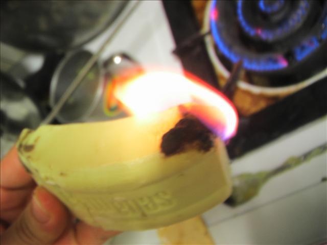 a-1. 30秒後開始燃燒變火皂,把我嚇了一大跳,差一點要棄火皂遣逃;燃燒幾秒後,怕燒到我的玉手,趕緊吹熄,滴在爐上的殘皂仍久久燃燒著(紅光),開始冒出濃煙與惡臭,燒過的皂一片焦黑
