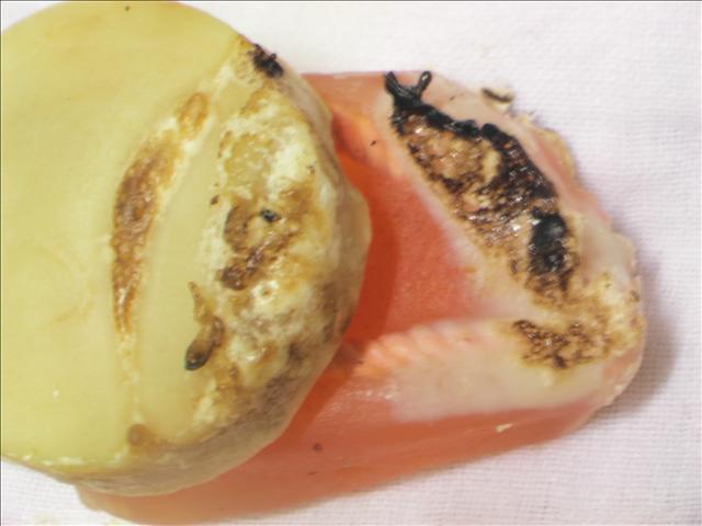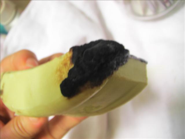 a-3. 30秒後快速溶解、皂滴滴落,小小燃燒,1.5分鐘後,表面結成像絲瓜酪一樣,但顏色較之稍焦黑,味道稍刺鼻