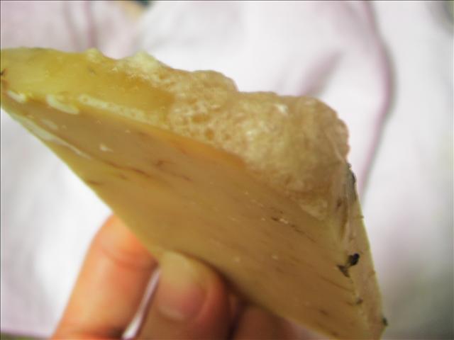 a-4 30秒後小小冒泡泡,最後表面結成像絲瓜酪一樣的泡泡網狀,1.5分鐘後,顏色稍變褐色,但沒有變黑,有餅乾或麵包剛出爐的味道 →研判可能因a-3含化學香精(Perfume)和色素,所以,顏色表面比較稍焦黑(再試驗了其他幾款手工皂,發現有添加色素或香精的,結果依然表面比較焦黑) 最貴的、名人、總統夫人愛用的不代表最好最天然。