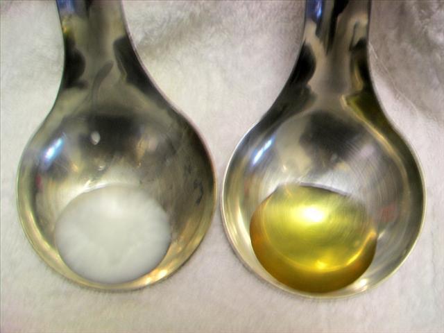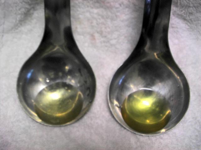 c-2 30秒後周圍先出現焦黑,小小沸騰,5分鐘僅周圍燒焦,大部分皂體仍保存,加水稀釋後輕鬆洗淨湯匙,皂水仍有洗淨力