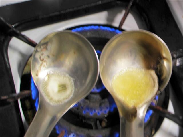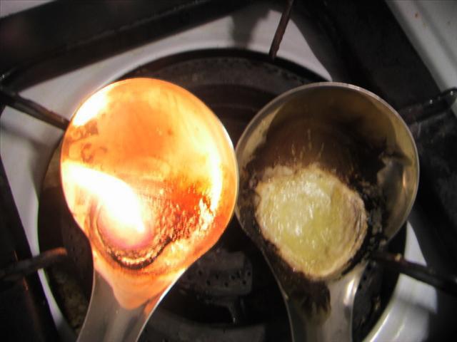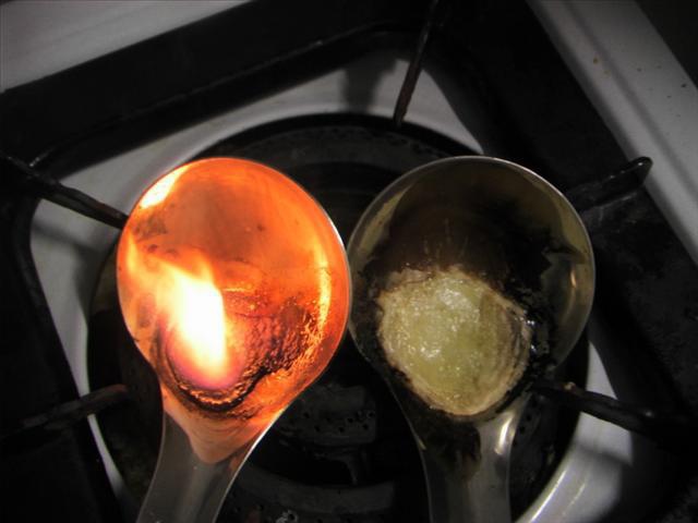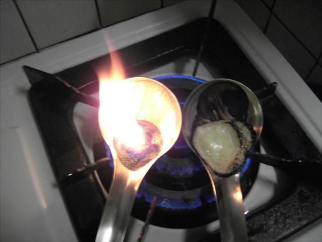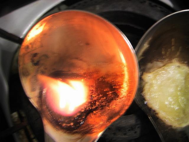 d1. 30秒後快速沸騰,水分蒸發較慢,80秒後開始燃燒變火皂(比潔膚露火光更猛),熊熊燃燒60秒(火皂燃燒30秒後關掉爐火),開始冒出濃煙與更刺鼻惡臭,5分鐘後燒過的液皂一片焦黑,需用刷子用力刷才能洗淨湯匙
