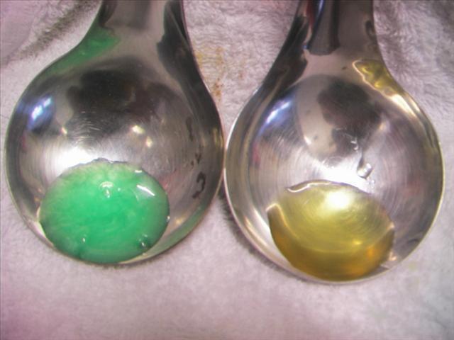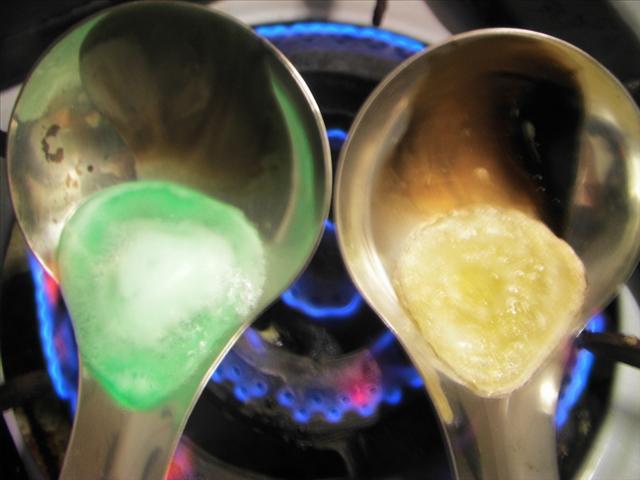 c-1. 顏色看起來就不是很自然的綠,30秒後快速沸騰,水分蒸發較泡泡露慢,75秒後開始燃燒變火皂(比泡x露火光更猛),熊熊燃燒60秒(火皂燃燒30秒後關掉爐火),開始冒出濃煙與刺鼻惡臭,5分鐘後燒過的液皂一片焦黑,需用刷子用力刷才能洗淨湯匙