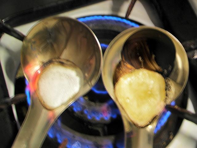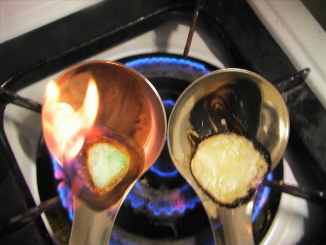 b-2 30秒後周圍先出現焦黑,小小沸騰,5分鐘僅周圍燒焦,大部分皂體仍保存,散發出爐麵包的味道,加水稀釋後輕鬆洗淨湯匙,皂水仍有洗淨力