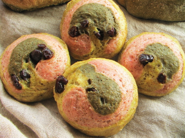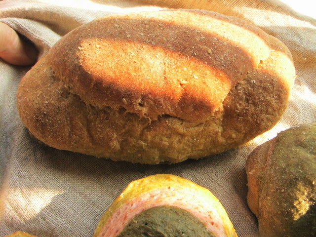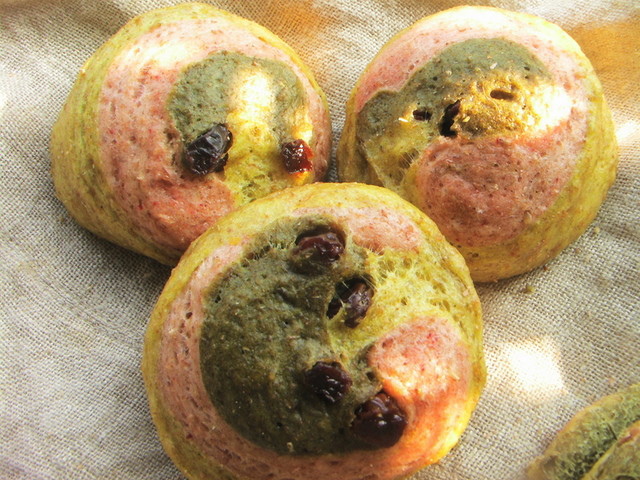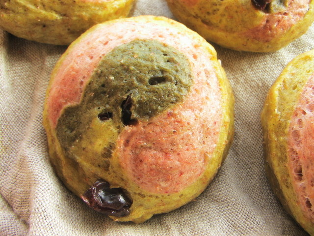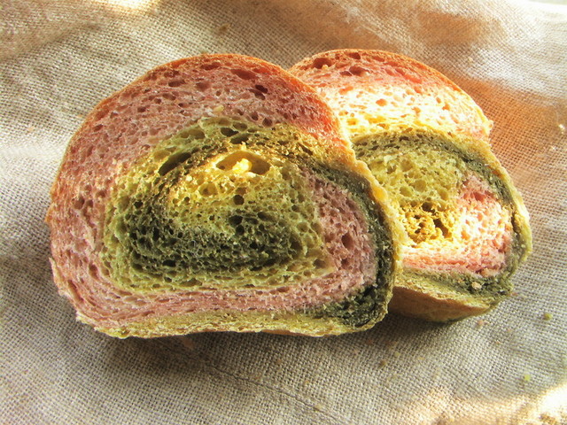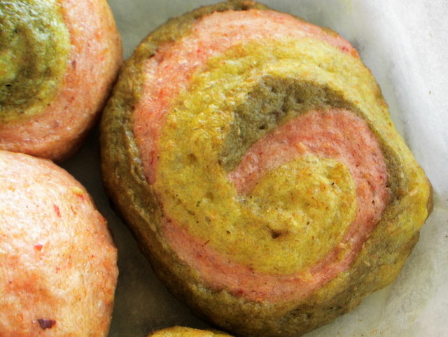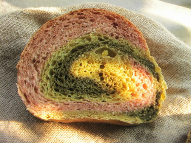 那如果把麵團拿來當麵包烤呢?也向麵包的口感,只是組織較鬆散、孔洞比較大,味道變淡了,顏色也變淺了不少,可見做麵包的酵母要少一點,糖和鹽的調味要多一些,還有發現高溫烤會破壞蔬果自然原色。
