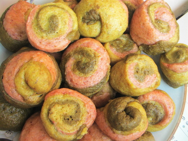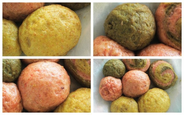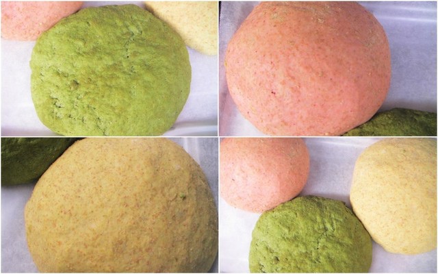 為了吸引Yama多多捧場,顏色一定要鮮豔美麗,當然,造形也不能過於單調,靈機一動加上紅麴醬,變成紅麴紅、南瓜黃和地瓜葉綠三色(竟然跟交通號誌一樣),二話不說馬上進行手作。
